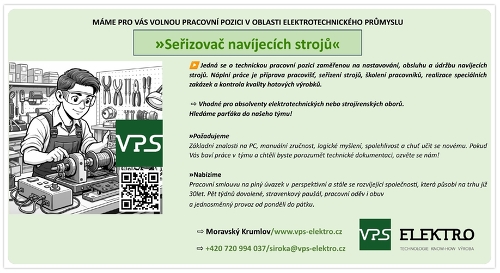Firma V.P.S. Elektro, s.r.o., Moravský Krumlov Vám nabízí volnou pracovní pozici v oblasti elektrotechnického průmyslu!